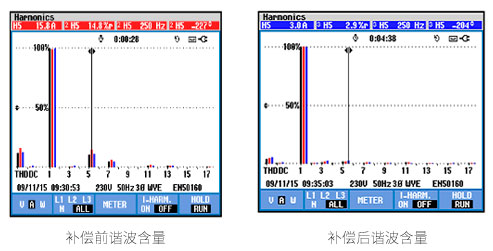 补偿前5次谐波电流15.8A畸变率14.8% ,补偿后5次谐波电流3A畸变率2.9%)